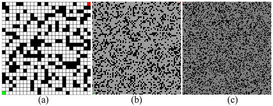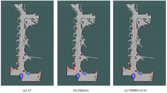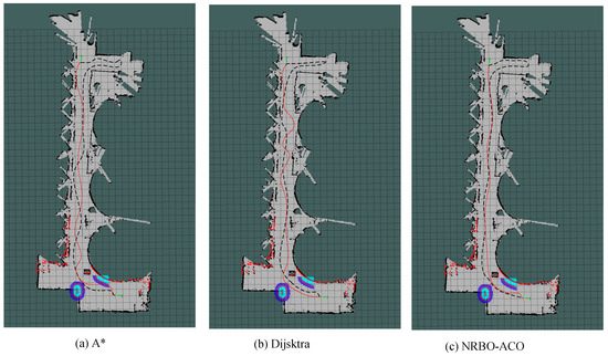 Path planning results in simulated aquaculture Environment 2. (a) A*, (b) Dijsktra, (c) NRBO-ACO.