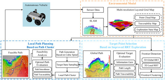 An overview of the proposed exploration framework. The vehicle senses the surrounding environment, and then the SLAM module uses the sensor data to output a global map. Based on the global map, we construct a multi-resolution layered grid map to provide environmental information for exploration. Next, the target selection module uses two RRTs to detect the frontier and obtain an accessible target and a corresponding global path. The global path is imported to the local planning module, which samples target states and generates a local path cluster. The optimal local path is then input into the vehicle.