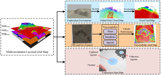 To simplify the environmental modeling of off-road environments, we construct a multi-resolution layered grid map for exploration. As shown in Figure 2, the model consists of the point cloud map , the exploration state map , and the traversability map . This approach saves storage space by representing the environment with various resolutions and facilitates faster access to relevant information to enhance the efficiency and effectiveness of exploration. stores the surface point clouds of the explored environment in the form of 3D voxel grids. This allows for a detailed representation of off-road terrain features and provides 3D terrain information for path planning to ensure vehicle’s safety. indicates whether each grid is explored or unexplored. Points located near unexplored grids are defined as frontier points. The exploration mission is considered completed when there are almost no detectable frontier points. quantifies the traversability of each grid and provides crucial information for target selection and path planning during exploration. This contributes to preventing accidents such as rollover and overturning during driving.