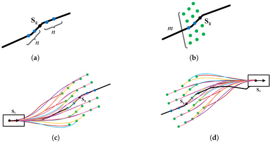 Local path sampling based on the global path. (a) Longitudinal sampling. (b) Lateral sampling. (c) The local path cluster obtained by sampling. (d) Planning reverse paths for the vehicle.
