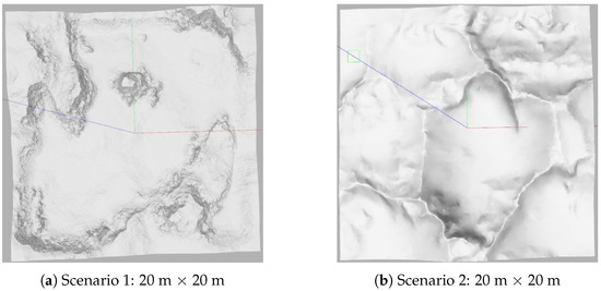 We conduct experiments in both simulation and real-world environments. Figure 4 shows the simulated wheeled vehicle model and the ground vehicle platform. In the simulation experiments, the simulation model is a four-wheel-drive differentially steered wheeled vehicle equipped with a 32-line lidar and the maximal speed is set to 0.8 m/s. The vehicle’s sensor range is set to 10 m. The exploration algorithm runs on a 2.2 GHz i7-8750 computer using a single CPU and employs the A-LOAM algorithm for environment mapping during the exploration. The map resolution for , , and is set to 0.1 m, 0.4 m, and 0.2 m, respectively; the max slope, roughness, and sparsity suitable for the vehicle is set to 25, 0.001, and 1.0, respectively; the step size of global and local RRT is 0.4 m and 0.8 m; the bandwidth used in the cluster is 1.0 m; and the total number of local path candidates is 55.