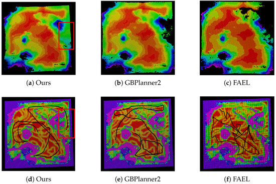Exploration results for Scenario 1. (a–c) The resulting point cloud map of the scenario (resolution = 0.1 m). (d–f) Our traversability grid map and the exploration paths (black lines) of three methods.