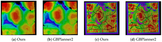 The evaluation metrics for the vehicle’s exploration include the time and distance required to complete the exploration, as well as the traversability cost of its travel path. The exploration time and distance are determined by the duration and the distance the vehicle travels when each method meets its respective end conditions for exploration. The traversability cost of the vehicle’s travel path is calculated based on Equation (15). Considering the difficulty in estimating the volume of off-road environments, we manually supervise each exploration process. Exploration is considered failed in cases where the vehicle is involved in an accident, the exploration is not completed within a reasonable time, or it covers an insufficient area by the end of the exploration.