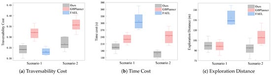 Statistics of exploration in simulation environments. (a) Traversability cost of the travel path. (b) Exploration time. (c) Exploration distance.