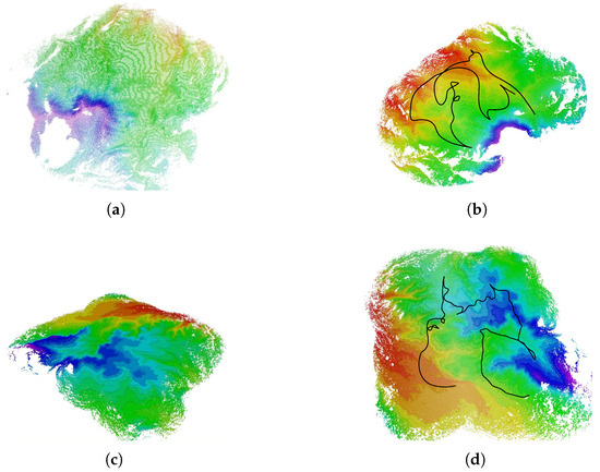 Exploration results for real environments. (a,b) The map and exploration path in the mountainous region. (c,d) The map and exploration path in the hilly region.
