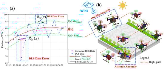 The downwelling light sensor (DLS) is a mainstream and effective device for ensuring accurate surface reflectance retrieval from rotary-wing UAV remote sensing data. The current mainstream solution involves mounting a DLS on top of the UAV to avoid propeller or fuselage obstructions, enabling unobstructed measurement of total radiance energy [1,2,3]. Modern DLS systems typically integrate an inertial measurement unit (IMU) to compensate for UAV attitude changes (roll/pitch/yaw) in real time, significantly improving radiometric measurement stability for short-duration missions (e.g., MicaSense’s DLS2, DJI’s D-RTK 2, etc.) [4,5,6]. However, during actual operations of rotary-wing UAVs, two primary factors may cause DLS data anomalies: attitude abnormalities and temporal misalignment between irradiance sensing and image capture [7,8,9]. First, both attitude adjustment and resistance to strong wind gusts are achieved by regulating the rotational speeds of the four motors, enabling flight maneuvers including hovering, rolling, pitching, yawing, and braking [10,11,12]. For instance, when strong wind gusts blow from the left, the UAV experiences rightward push causing right roll (right side tilting downward) [13,14]. Although the system generates a leftward restoring torque to level the UAV, strong wind gusts may still induce significant attitude abnormalities. [15,16]. During turning maneuvers, nearly all rotary-wing UAVs implement a braking strategy by ‘accelerating front rotors while decelerating rear rotors,’ which creates a pitch-up torque that raises the nose—this braking action induces noticeable fore-aft oscillations [17,18]. Secondly, taking the commonly used MicaSense DLS 2 and Parrot Sequoia DLS as examples, these downwelling light sensors typically employ silicon photodiode arrays as internal detectors and are equipped with integration time control functionality [19,20,21]. The output of each spectral channel represents the integrated average of incident radiant energy received within a short sampling window, thereby enabling near-instantaneous sensing of downwelling irradiance. Although DLS systems and multispectral cameras are generally configured for ‘synchronized triggering’, the sampling periods of both systems are not strictly aligned in time [22,23,24]. Specifically, the integration time of the DLS can range from several hundred microseconds to tens of milliseconds, whereas the camera exposure duration is typically limited to only a few milliseconds [25,26]. The subtle yet inherent timing discrepancy has minimal impact during stable flight. However, it becomes pronounced during UAV turning or rapid attitude changes, potentially causing mismatch between DLS-recorded irradiance and actual illumination conditions at image capture moment, thus introducing reflectance estimation errors [23].