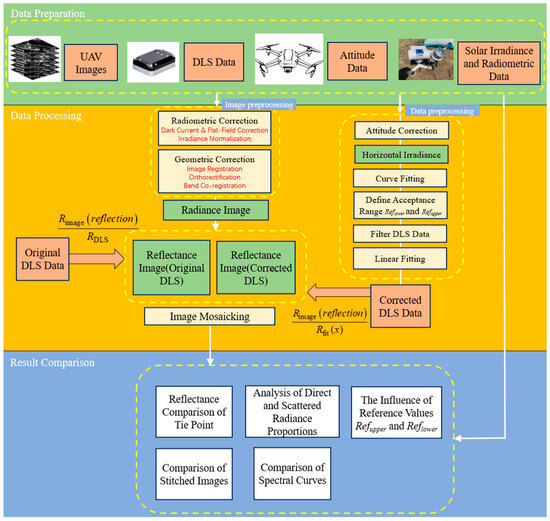 The experiment comprised three main components: Data Preparation, Data Processing, and Result Comparison (as shown in Figure 2). In the Data Preparation phase, four types of data were collected: UAV Images, DLS Data, Attitude Data, and Solar Irradiance and Radiometric Data. Subsequently, image preprocessing was performed on the UAV imagery, including radiometric correction and geometric correction, resulting in the generation of radiance images. The radiometric correction process comprised two main steps. The first step was Dark Current and Flat-Field Correction, which aimed to eliminate the camera’s internal thermal noise and correct for illumination non-uniformity. The second step was Irradiance Normalization, which was necessary for the subsequent reflectance calculation. Geometric correction involved three components: image registration, orthorectification, and band co-registration. Next, the DLS Data were combined with the Attitude Data to perform Attitude Correction, thereby producing Horizontal Irradiance data (in some cases, DLS systems can directly provide Horizontal Irradiance). The proposed FIM-DC Model was then applied. First, Curve Fitting was conducted on the Horizontal Irradiance data. An Acceptance Range was defined using two reference values, and . Following this, DLS Data Filtering was performed to remove outlier points that fell outside the acceptable range, and these removed points were subsequently supplemented using Linear Interpolation between adjacent valid data points. Based on this process, Reflectance Images were calculated using two methods: one based on the original DLS data (Reflectance Image (Original DLS)), and the other using the corrected DLS data (Reflectance Image (Corrected DLS)). These images were then used to perform Image Mosaicking, which served as the basis for subsequent result comparisons. In the Result Comparison phase, five aspects were analyzed: Reflectance Comparison of Tie Points, where tie points from images taken at different times were selected for comparison; analysis of the differences between Direct and Scattered Irradiance in DLS data and Solar Irradiance and Radiometric Data; Comparison of Stitched Images; Comparison of Spectral Curves; and finally, a discussion of the influence of the reference values and in the Section 5.3.
