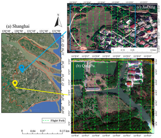 The experiment was conducted in Qingpu District and Jiading District of Shanghai, China, with the central coordinates of the test areas located at [121°8′20″ E, 31°6′3″ N] and [121°9′47″ E, 31°16′36″ N] (see Figure 3). The tests were carried out on 18 March 2025, and 14 December 2023. The experimental area in Qingpu District covered approximately 8.6 ha, while the experimental area in Jiading District was 14 ha. Both experimental areas included diverse land cover types such as water bodies, artificial structures, trees, grassland, and bare soil. This research adopted 0.95 and 1.05 as the reference values. A rotary-wing UAV (DJI M300) equipped with a DLS was used to perform aerial photography missions. The UAV conducted flights approximately every 15 min, with each flight lasting about 15 min. The UAV flight path is indicated by the green dashed lines in Figure 3.