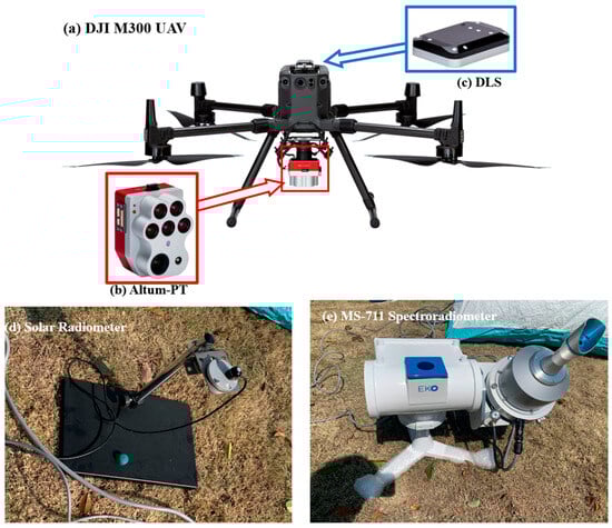 Experimental equipment: (a) DJI M300 UAV (SZ DJI Technology Co., Ltd., Shenzhen, China); (b) Altum-PT multispectral camera (MicaSense, Inc., Seattle, WA, USA); (c) downwelling light sensor (MicaSense, Inc., Seattle, WA, USA); (d) solar radiometer (Apogee Instruments, Inc., Logan, UT, USA); (e) MS-711 spectroradiometer (Malvern Panalytical Ltd., Malvern, UK).