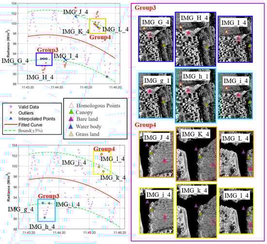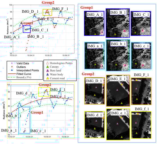 Tie points, which are points commonly captured across successive UAV images, should exhibit nearly identical reflectance values across all bands for the preceding and following five images. Therefore, when UAV attitude anomalies occur, the reflectance of tie points in the anomalous images deviates from that of the adjacent images. Consequently, whether the FIM-DC method can correct the reflectance values of tie points affected by attitude anomalies to match those in adjacent images serves as a crucial criterion for evaluating the effectiveness of FIM-DC. Figure 5 presents the data from the second flight mission of the Qingpu experiment, with a takeoff time of 10:45:31 and a landing time of 10:59:53. Tie points were selected for comparison from two groups: Group 1, in which the DLS data exhibited both positive and negative deviations, and Group 2, in which the DLS data showed consistently positive deviations. A total of four typical land cover types were selected from 12 images, namely canopy, bare land, water body, and cement road. As indicated in the figure captions of Figure 5, labels with uppercase letters (e.g., IMG_A_1) represent corrected data, while labels with lowercase letters (e.g., IMG_a_1) represent original, uncorrected data. Group 1 and Group 2 in Figure 5, respectively, illustrate the locations and types of the selected tie points. Table 3 presents the reflectance comparison of the tie points shown in Figure 5. It can be observed that, after FIM-DC correction, the canopy reflectance in IMG_A_1, IMG_B_1, and IMG_C_1 remained stable at approximately 13%. In contrast, in the original uncorrected data (IMG_b_1 and IMG_c_1), the canopy reflectance surged to around 40% due to anomalies in the DLS data. The standard deviation was used to evaluate the degree of deviation in the data. Based on this, the standard deviation of canopy reflectance in Group 1 was calculated to be 15.07% before correction and reduced to 0.58% after applying the FIM-DC method.