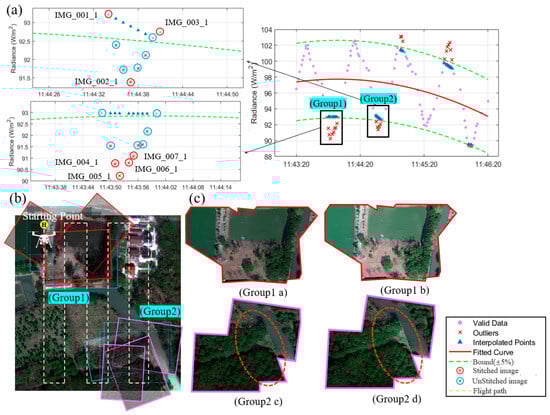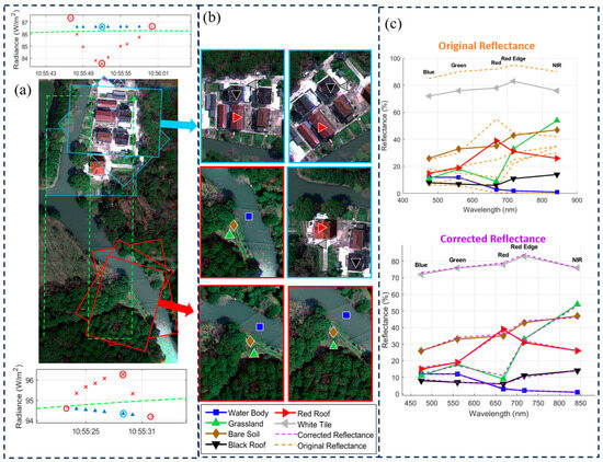 where denotes the reflectance of the ground feature, and represents the reflected radiance energy. and correspond to the DLS-recorded incident radiance energy before and after correction, respectively. Curve (the red curve in Figure 1a) represents the quadratic fitting of the original DLS data. The reference values and are critical correction parameters, which are determined autonomously through a comprehensive consideration of flight time, takeoff time, the oscillation range of the DLS data, and other relevant factors.