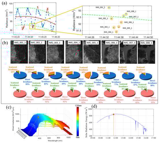 Analysis of scattered irradiance and direct irradiance proportions: (a) selected image data; (b) proportions of scattered and direct irradiance with corresponding images; (c) radiometric data; (d) solar irradiance data.