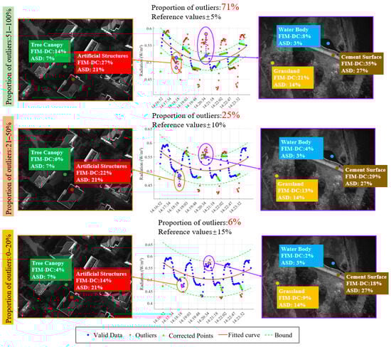 To illustrate how a and b are set in different experimental scenarios, Figure 10 presents data from the Jiading test site, which is distinct from the previously discussed Qingpu site. Since the FIM-DC model identifies certain DLS data points as outliers, Figure 10 displays three separate cases where the proportion of outliers is set to 0–20%, 21–50%, and 51–100%, respectively. In the Jiading experiment, we used an ASD spectroradiometer to measure the reflectance of five typical land cover types—Tree Canopy, Grassland, Artificial Structures, Cement Surface, and Water Body—across six spectral bands. The measurements obtained by the ASD instrument are considered the ground-truth reflectance values of these surfaces. Figure 10 illustrates the true reflectance values in Band 3 for these five land cover types, as well as the corresponding reflectance values calculated by the FIM-DC model under different combinations of parameters and . When the proportion of outliers was set to 5.79%, the reference range was defined as ±15% around the fitted curve, meaning that values within 15% of the curve were treated as acceptable. Under this configuration, the reflectance values estimated by the FIM-DC model were generally lower than the ASD-measured values. For instance, the reflectance of Cement Surface measured by the ASD spectroradiometer was 27%, while the FIM-DC result was only 18%. This discrepancy occurred because very few points were corrected, and the original abnormal reflectance values remained largely unmodified. In another case, when the proportion of outliers was set to 70.53%, the vast majority of points were treated as outliers, which is clearly incorrect. The results showed that this led to a significant overestimation of reflectance values. After multiple trials, it was found that setting the proportion of outliers within the range of 21% to 50% yielded the most reasonable results. Within this range, the estimated reflectance closely matched the ground-truth values. Experiments conducted in both the Jiading and Qingpu test areas consistently supported this conclusion.