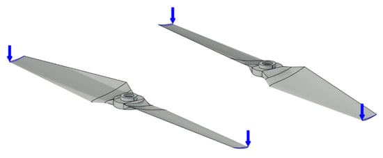 The simulation for the propellers is conducted by approximating the maximum thrust model to be twice the weight of the drone; the weight of the drone is 10.79 N, therefore, the simulated force is 21.58 N. This force is distributed across the four motors and two tips per propeller blade, resulting in approximately 2.69 N per propeller blade tip. The study is simplified by applying a load of 3N at the tips of the blades to analyse how the lift distribution affects the performance of the propeller and evaluate its strength. Figure 3 illustrates the exact points where the force is applied.