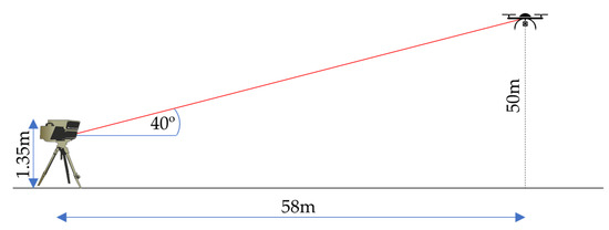 As illustrated in Figure 5, the setup involves a RADAR system mounted on a tripod at 1.35 m above the ground. The RADAR is inclined at an angle of 40° from the horizontal and aligned parallel to the drone’s intended flight path. This inclination helps minimize false detections from ground clutter.