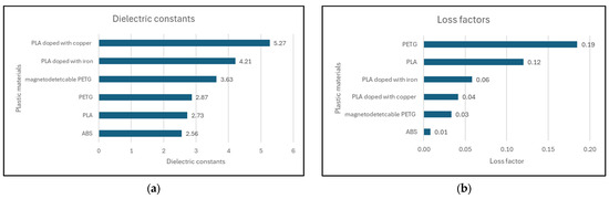 Figure 6a,b show the results of the dielectric constants and loss factors obtained after analyzing the cylinders from the materials described in Section 2.1.