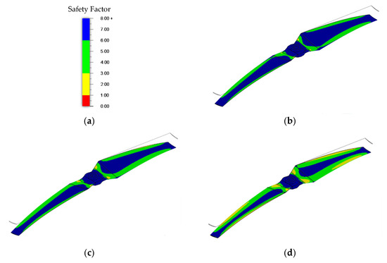 (a) Safety factor scale; (b) PLA simulation; (c) PETG simulation; (d) ABS simulation; all materials tested at 3 N of force at the wing tips of the propellers.