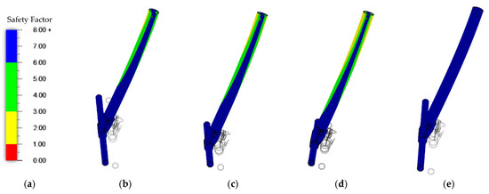 (a) Safety factor scale; (b) PLA simulation; (c) PETG simulation; (d) ABS simulation; (e) carbon fiber simulation. All materials tested at 30 N of force.