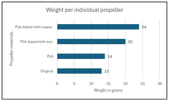 In contrast, PLA presented no manufacturing difficulties. As a result, only plain PLA, PLA doped with copper, and PLA doped with iron were selected for production. Figure 9 presents the weight of each individual propeller.