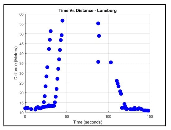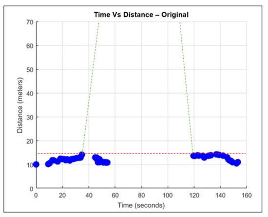 Figure 11 illustrates the drone’s expected flight path in green, with its maximum detection range of 14 m, highlighted in red. At 110 s, the radar detects the drone’s return and reads the data that is plotted on the right side of the graph.