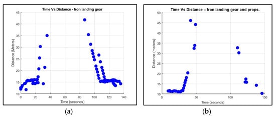 (a) PLA doped with iron landing gear maximum distance; (b) PLA doped with iron landing gear and propellers’ maximum distance.