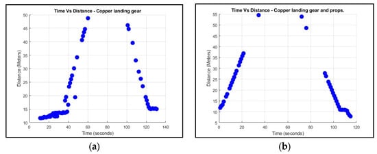 The findings from Figure 13 demonstrate that the most detectable material is PLA doped with copper. In Figure 13a, the maximum detectable distance was 49 m only with the landing gear and 55 m including the propellers, and a 6 m difference when using copper-doped propellers.
