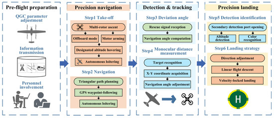A comprehensive technical pipeline has been developed for the autonomous navigation and precision landing of UAVs, encompassing all phases from mission initialization to final touchdown. The system leverages a multi-sensor fusion-based autonomous navigation algorithm, along with advanced target recognition techniques, to address challenges such as low positioning accuracy, limited target-tracking capabilities, and reduced landing precision in complex maritime environments. To further enhance performance during the final approach phase, an innovative landing scheme is introduced, as shown in Figure 2.