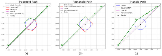 Since kd = 500, substituting the coordinates of point O and the path function yields k1 and k2. Based on the coordinates of A, B, and C, the path length function is calculated as F(a). When a ∈ [−1700, −1600], its derivative f(a) < 0. Therefore, when the center of the circle is (−1600, −1800), the path of the triangle is the shortest, and the shortest path is 5003.031 m. To sum up, the length range of the triangular path is [5003.031, 5054.194] m. An analysis of the rectangular path and the trapezoidal path reveals that when the center of the circle moves along the AC direction, the path configuration remains unchanged, and the path length remains constant. The path is the longest when the center of the circle falls exactly on AC. The path is the longest when the center of the circle is located at two points: (−1800, −1600) and (−1600, −1800). After measurement, the range of the rectangular path is [5666.905, 5949.747] m; the trapezoidal path range is [5363.798, 5527.096] m.