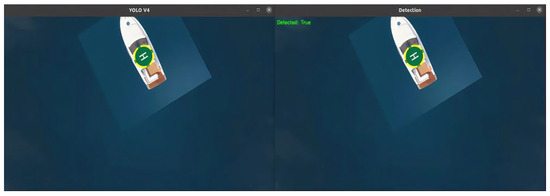 Upon reaching the GPS guidance location, the UAV transitions to the target recognition phase. The on-board YOLOv4 model is activated, and the simulated camera continuously captures the surrounding environment. The UAV then rapidly identifies and locks onto the real distressed ship.
