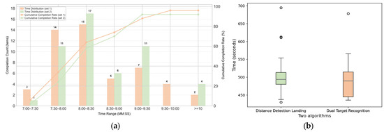 Given that the length of the triangular path ranges from 5003.031 m to 5054.194 m, the variation in length is approximately 50 m. Additionally, the UAV operates in fixed-wing mode, so factor 1 can be disregarded. Therefore, the primary reason for the different completion times of the maritime rescue mission is the varying target detection efficiency of the UAV during landing. In this study, a landing time exceeding 10 min is defined as a failure. The comparison of the distance detection algorithm (set 1) and the dual-target recognition and motion tracking algorithm (set 2) is shown in Figure 10.
