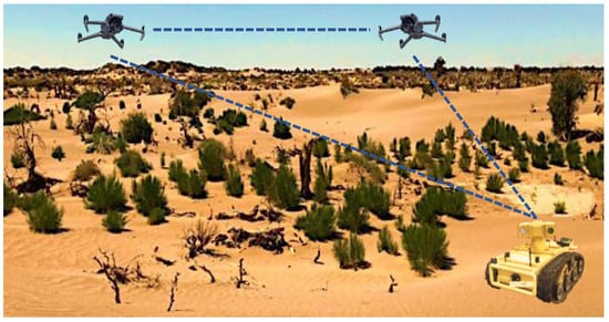 With the continuous advancement of computer vision and artificial intelligence, robot technology has entered a new stage of rapid development [1,2]. Among these advancements, CSLAM (collaborative simultaneous localization and mapping) has emerged as a core technology for multi-robot cooperative perception and environmental understanding, driving the intelligent evolution of robotics [3,4]. CSLAM tightly integrates environmental perception with multi-robot state estimation, enabling not only high-quality mapping and precise positioning but also improving robots’ adaptability to complex environments [5,6,7]. As a result, robots can operate in broader areas and accomplish more sophisticated tasks. However, while multi-robot collaboration within a single domain has shown great potential, it still faces inherent limitations [8]. To overcome these challenges, air–ground cross-domain collaborative multi-robot SLAM has gained increasing attention as a promising research direction [9,10]. By leveraging the complementary strengths of UAVs and UGVs —such as differences in motion characteristics, load capacity, and communication—this approach significantly expands the application scope of robotic systems, as shown in Figure 1.