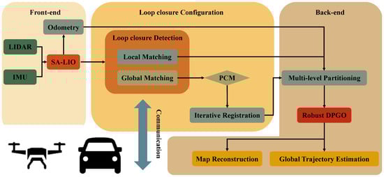 Figure 2 demonstrates the architectural framework of the distributed multi-robot collaborative SLAM method based on air–ground cross-domain cooperation. The framework achieves environmental perception and global optimization through a coordinated mechanism integrating three modules, namely the robot-local front-end module, the distributed loop closure configuration module, and the robust DPGO back-end module. In the robot-local front-end module, both UGVs and UAVs employ SA-LIO [28] methodology to process raw LiDAR–IMU measurements, producing real-time local odometer trajectories while extracting semantic-assisted loop closure keyframes. The next step involves establishing good communication between robots. The distributed loop closure configuration module begins by utilizing the PCM incremental anomaly detection module to filter out erroneous loop closure detection keyframes that may arise from interactions between different robots. Only valid loop closure keyframes are retained for further processing. Next, an iterative registration method based on semantic and geometric features assistance calculates the precise transformation matrix between the corresponding valid loop closure detection keyframes. This process provides a reliable initialization for relative pose measurement used in the back-end DPGO. Finally, the robust DPGO back-end module constructs a multi-level balanced optimization subgraph based on the degree of coupling between the relative pose measurements of robot nodes. It constructs a majorization–minimization substitute function for nontrivial loss kernel optimization to integrate and optimize intra-robot local pose estimations and inter-robot relative pose, thereby achieving globally optimal trajectory estimation and high-precision map construction. The technical implementations of these modules will be comprehensively discussed in the following sections.