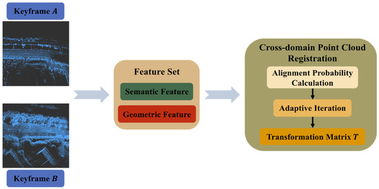 To achieve precise global coordinate transformation, we recast the problem of minimizing coordinate transformation error as a probabilistic correspondence problem in heterogeneous point cloud alignment. Specifically, the higher the probability of the corresponding point in the local ring closed mapping, the smaller the error of the correlation coordinate transformation, and the higher the precision of the transformation matrix [27]. Consequently, we propose an iterative registration method based on semantic and geometric feature assistance. The method structure is shown in Figure 3, which integrates semantic and geometric descriptors. It is followed by an iterative optimization scheme to determine the loop closure transformation matrix through successive refinements of and .