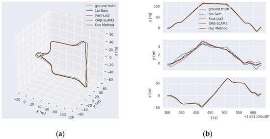 Ground-01 is a loop closure sequence with a relatively high traveling speed, and the absence of distinctive building features poses a significant challenge for feature matching. Figure 8 presents the comparison between the ground truth trajectory and the trajectory estimation by four methods for Ground-01. Specifically, Figure 8a,b display the comparison of the overall trajectory alignment error and the alignment error in each direction for each method on Ground-01, respectively. From the overall trajectory comparison graphs, it is evident that our method achieves the smallest error when compared to the ground truth trajectory. In the latter part of the sequence, as the speed increases, the trajectory and relative rotation errors in the y-direction for the predicted trajectories of other methods increase significantly. However, our method significantly reduces trajectory drift, especially the relative trajectory errors in each direction.