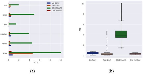 The ATE comparison results of each method on the Aerial-03 sequence of the GRACO dataset: (a) The comparison results of various ATE indicators; (b) the comparison results of the ATE box plots.