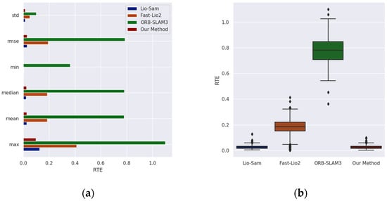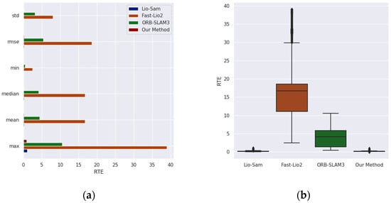 The RTE comparison results of each method on the Ground-01 sequence of the GRACO dataset: (a) The comparison results of various RTE indicators; (b) the comparison results of the RTE box plots.