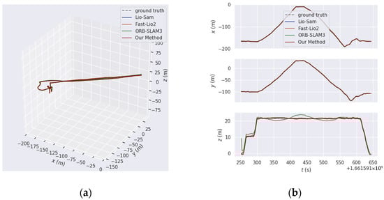 The comparison results of trajectory estimation by each method and ground truth trajectory in the Aerial-03 sequence of the GRACO dataset: (a) The comparison results of trajectory alignment errors of each method; (b) the comparison results of trajectory errors in each direction of each method.