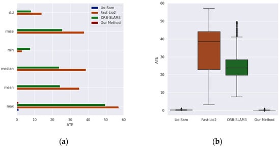As shown in Figure 12, the ATE comparison chart for each method on the Aerial-03 sequence is presented. It is evident from the comparison chart that our method outperforms the others in all ATE indicators. The mean absolute error of our method is 0.166, which represents reductions of 0.384, 35.848, and 24.034 compared to Lio-Sam, Fast-Lio2, and ORB-SLAM3, respectively.