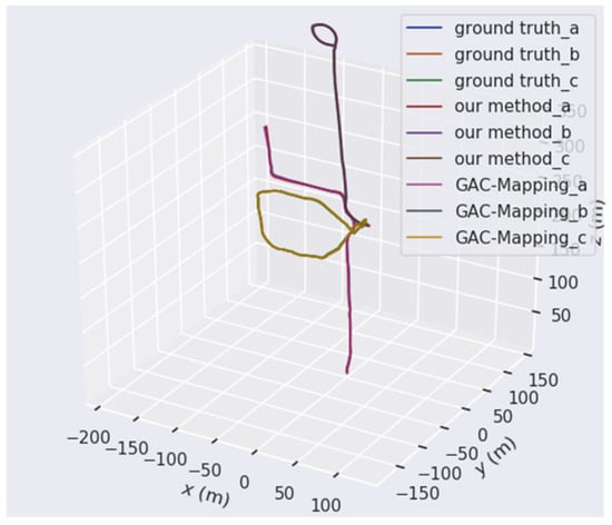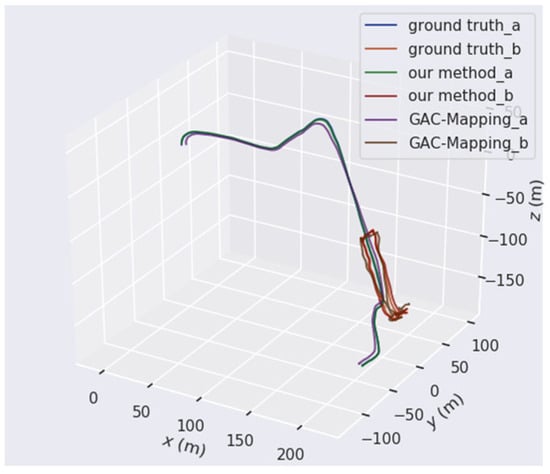 Figure 16 compares the trajectory estimation of an air–ground collaborative team, consisting of one UAV and two UGVs, with the ground truth trajectories. The UAV uses the Aerial-08 sequence from the GRACO dataset, while the two UGVs utilize the Ground-03 and Ground-06 sequences, respectively, from the same dataset. The comparison of global trajectories clearly shows that our method outperforms GAC-Mapping. In the intersection area between the air and the ground, GAC-Mapping exhibited significant trajectory errors. In contrast, our method demonstrated the smallest trajectory deviation and lower cumulative error. These results suggest that our method effectively utilizes loop closure detection from both the UAV and UGVs, leading to accurate global trajectory estimation.