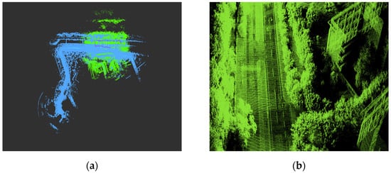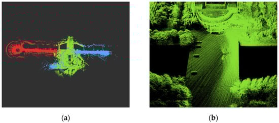 The map construction effect, shown in Figure 17a, further highlights our method’s effectiveness in air–ground cross-domain collaborative SLAM tasks. It successfully integrates the map information from both UAVs and UGVs, generating an environment map with rich details and global consistency. Specifically, our method seamlessly merges the local maps of multiple robots into a unified global map. The map not only boasts a high level of detail but also maintains excellent consistency with the actual environment. Additionally, as shown in the magnified local detail map in Figure 17b, the constructed map exhibits high consistency. The transitions between roads, buildings, trees, and other elements along the streets are smooth, the edges are neat, and there are very few outlying points.