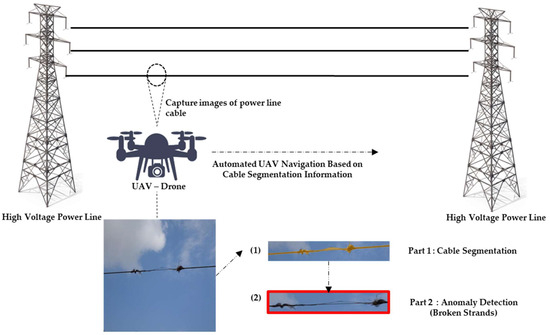Section 3.2). This is particularly relevant, since both tasks focus on the same physical component (the cable), albeit in different states (normal vs. defective). Conversely, the anomaly detection branch also benefits from the segmentation process. Learning to detect localized defects sharpens the model’s attention on critical regions—often near cable boundaries—thereby improving the segmentation precision and reducing confusion with background elements. This reciprocal learning mechanism encourages a richer and more discriminative feature space. Second, although segmentation is not directly involved for anomaly detection during inference, it remains crucial for many practical UAV-based applications. For instance, segmentation maps can support autonomous navigation by enabling a drone to follow the cable path in real time, while simultaneously detecting anomalies. This dual-output design therefore provides both technical synergy and operational flexibility.