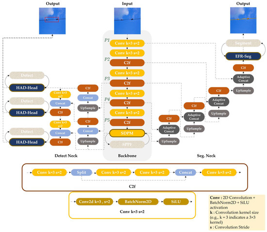 Figure 2. It effectively acts as a form of learnable dropout, allowing the network to suppress noisy or redundant spatial information and enhancing the robustness of the segmentation output. This refined multi-scale path is then directed to the Edge-Enhanced Refinement (EFR-Seg) head, which specializes in reconstructing cable masks with high boundary fidelity and structural consistency.