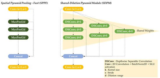Figure 2, top), which progressively extracts multi-scale features through a cascade of convolutional and residual blocks. Specifically, the image passes through successive Conv → C2f layers with increasing channel depths and downsampling strides, enabling the model to capture both low-level spatial textures and high-level semantic structures. Each Conv block consists of a convolutional layer followed by batch normalization and a SiLU activation function. These operations yield feature maps at five spatial resolutions (P1 to P5), where P5 corresponds to the deepest layer with the smallest spatial resolution and highest semantic abstraction. At the deepest level (P5), we replace the original SPPF block from YOLOv8 with our custom Shared Dilation Pyramid Module (SDPM). This module increases the effective receptive field by applying multiple depthwise separable convolutions with different dilation rates, thereby enriching the feature representations without adding substantial computational burden. This replacement is highlighted in yellow in