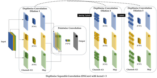 Figure 4). For example, for dilation rates 1, 3, and 5, the same filter W is reused at different scales: F.conv2d (input, weight = W, dilation = d). This design enables efficient multi-scale feature extraction without introducing redundant parameters. Finally, the extracted multi-scale features are concatenated and refined through a final 1 × 1 convolution block (Conv2D + BatchNorm + SiLU), which ensures smooth feature integration before passing them to the neck.