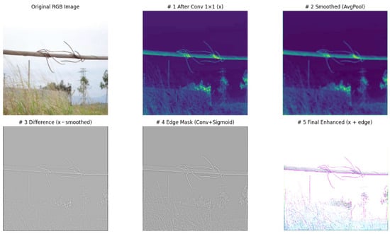 The core purpose of the Edge Enhancer module is to function as a lightweight, learnable edge detector by isolating high-frequency components within the feature map and amplifying boundary-specific signals to support downstream segmentation. Importantly, the design philosophy behind this module is not to replace or suppress the original features but to softly enrich them. It preserves the full semantic content of the input and selectively adds edge-focused cues on top. As a result, even if the added signal is not perfectly accurate, the underlying information remains unaffected, making the enhancer non-destructive, safe, and effective in guiding the network’s attention toward fine structures such as thin cables.