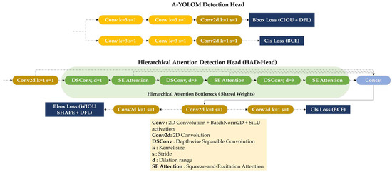Figure 7, the HAD head follows a carefully designed sequence of operations to jointly produce bounding-box and classification predictions in an efficient manner. It starts with a 1 × 1 convolutional projection layer that reduces the number of channels and standardizes feature representations, ensuring a compact and normalized input space for subsequent processing.