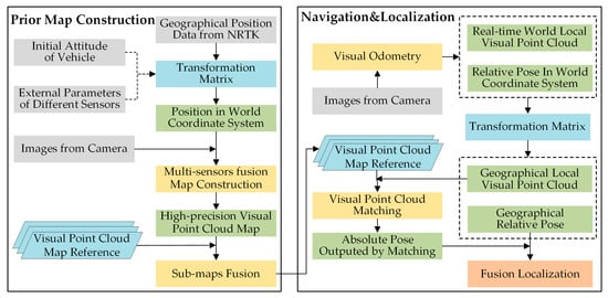 This paper proposes a visual point cloud map construction and matching localization method for autonomous vehicles. The overall framework of the system is illustrated in Figure 1, which is divided into two temporal phases: prior map construction and navigation localization. During the map construction phase, i.e., the “free time” when satellite signals are available. Network Real-Time Kinematic (NRTK) [42] can provide global high-precision drift-free positioning data. The SAMC method fuses it to the Visual SLAM system, which can effectively suppress cumulative error while providing absolute geographical reference to the SLAM-constructed relative map.
