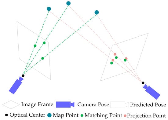 where represents Euclidean norm, represents the pixel coordinates of the spatial point’s matching point in frame , denotes the intrinsic parameters of the camera, represents the pose of frame , signifies the spatial point’s position in the world coordinate system, and denotes the depth of point along the camera’s optical axis in the camera coordinate system.