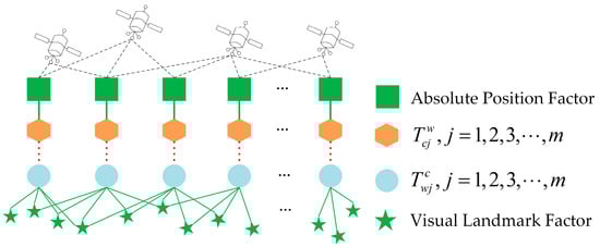 where , , and represent robust kernel functions, , , and denote the covariance matrices. The optimization process is primarily based on image feature point matching, so we set the weight of (in pixels) as the reference value. Variations in (in Lie algebra) affect all reprojection points, and its weight is set to the number of reprojection edges to match the constraint magnitude. (in meters) is strongly constrained by , similarly affecting all reprojection points. Its weight is set to one-tenth of the number of reprojection edges to balance the scale difference between pixels and meters based on the theory of noise variance ratio [45,46]. Using this method, we can effectively balance reprojection and absolute position errors by ensuring the enforced constraints of inverse external parameters. The global optimization factor graph of the point cloud map construction is shown in Figure 3. When the tracking is over, we optimize all keyframes and points of the map and then transform the VPCM into the geographical coordinate system.
