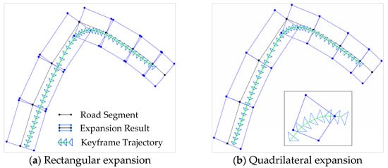 The SAMC method determines the road segment to which the keyframe belongs based on its geographic location. We extend the rectangular and quadrilateral expansion methods from [44] to the geographical coordinate system, as shown in Figure 4a and Figure 4b, respectively. The point cloud of RNBE is composed of all map points observable by the keyframes belonging to the RNBE. In general, the intersections of the roads often have multiple results of quadrilateral expansions, which overlap each other. The keyframes located here usually belong to multiple RNBEs.